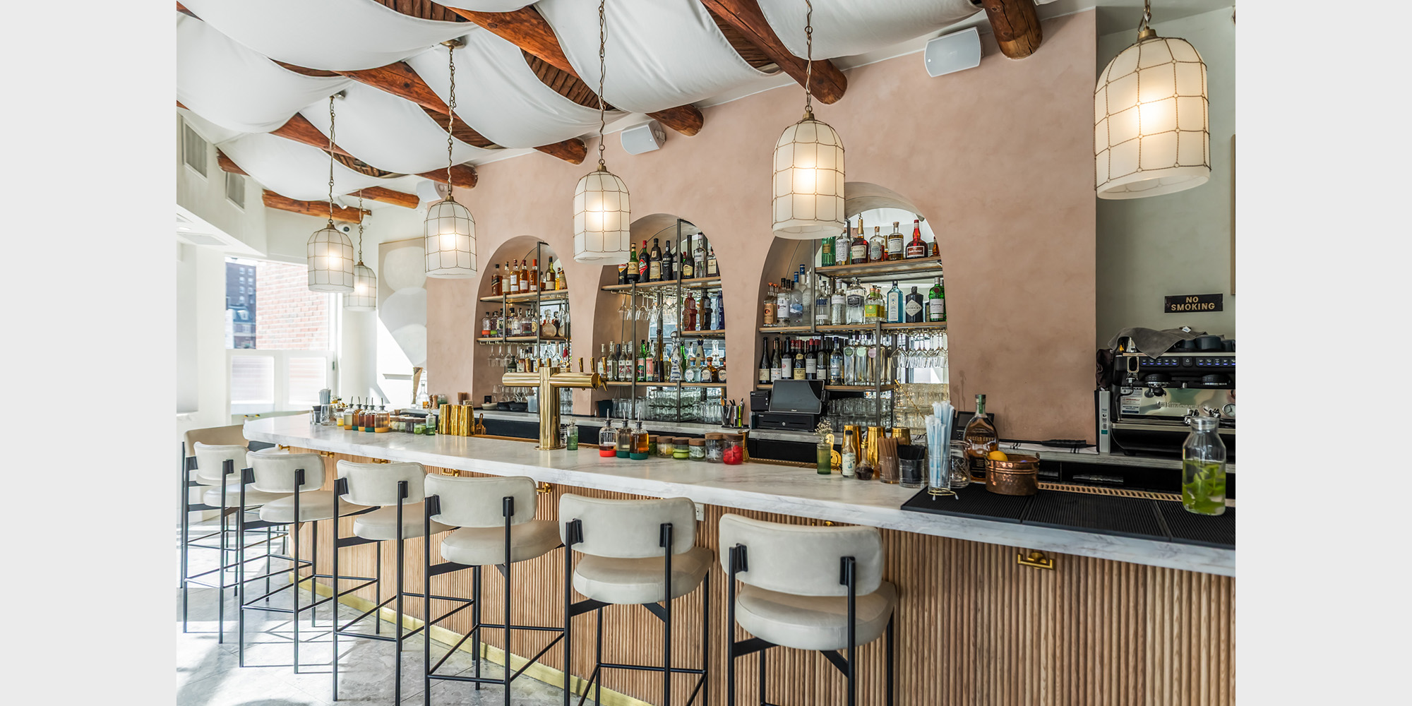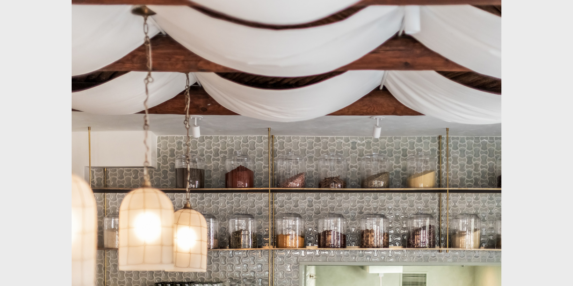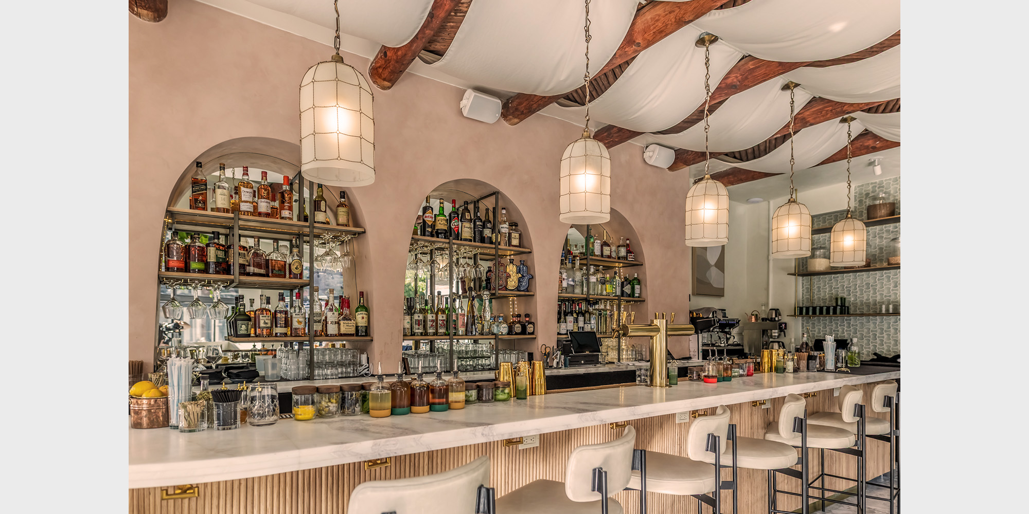 A sun-drenched solarium greets guests upon arrival, leading into a lounge anchored by a striking wood-and-marble bar, with soft textures and earthy tones create the first scene in the restaurant’s experience. From the lounge, the restaurant unfolds into three distinct dining spaces, each designed with its own personality, creating a range of experiences throughout the restaurant. The main dining room is anchored by a lively mezze counter, where guests can watch fresh small plates being prepared while perched on a marble and sage-colored bar. The next space is marked by its brightness, where colorful light fixtures and bold accents infuse a sense of playfulness. The final dining room, accessed through arched openings, offers seclusion and intimacy – a private dining space that feels tucked away, ideal for intimate gatherings that call for a sense of occasion.