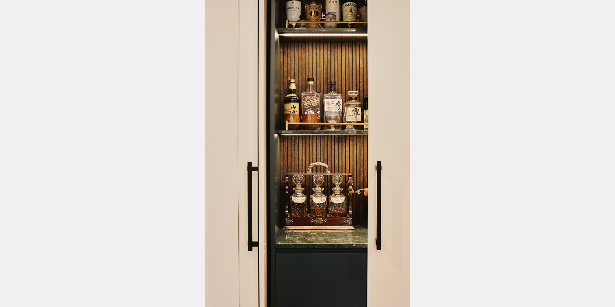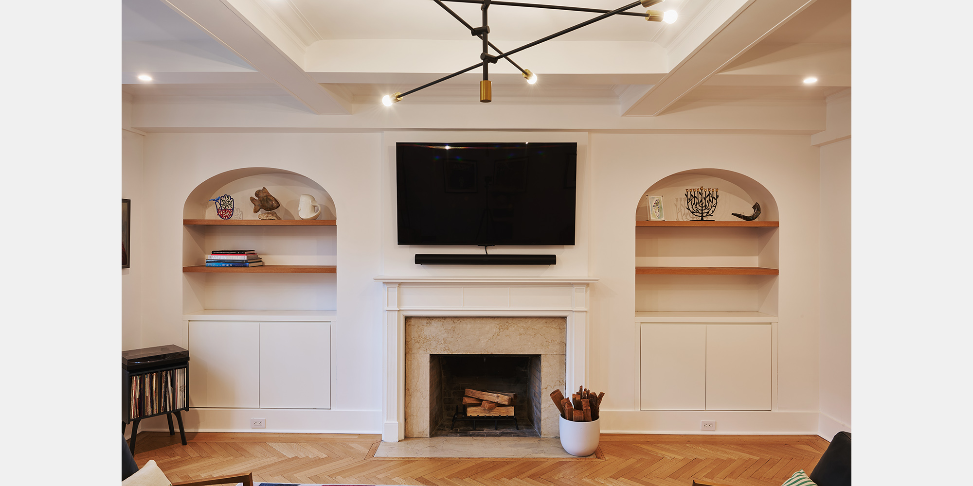The living room anchors the design with herringbone oak floors, a restored marble fireplace flanking arched built-ins with warm wood shelving, and a restored coffered ceiling fitted with a sculptural pendant. A bespoke bar cabinet, concealed behind lacquered doors, reveals fluted wood paneling, green marble surfaces, and brass hardware within – a quiet luxury hidden in plain sight.