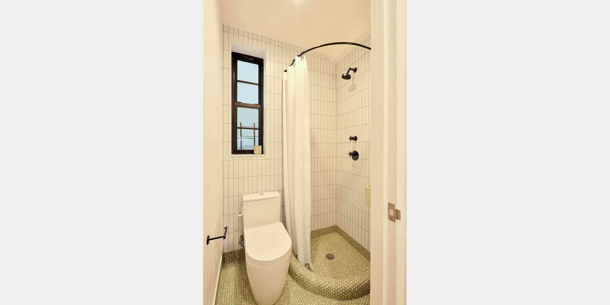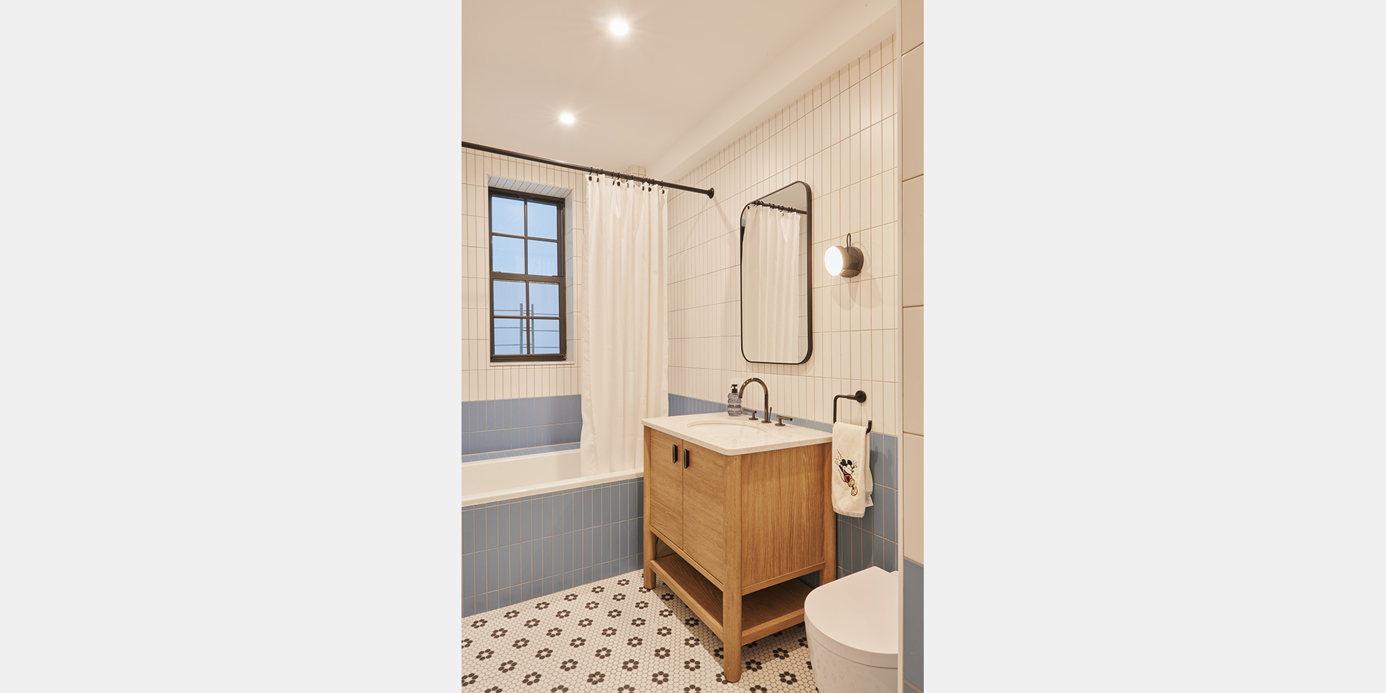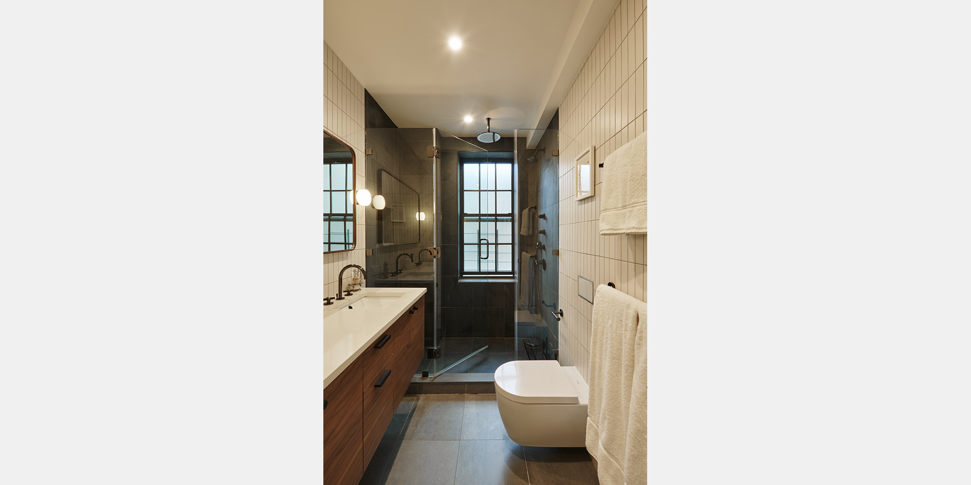 The newly conceived primary suite offers a serene retreat, complete with a walnut double vanity, dark slate tile, and a glass-enclosed rain shower. The primary bedroom is lined with floor-to-ceiling white oak millwork that integrates seamlessly into the space. The secondary bath offers a playful counterpoint with colorful tiles, a patterned mosaic floors, and a warm oak vanity.
