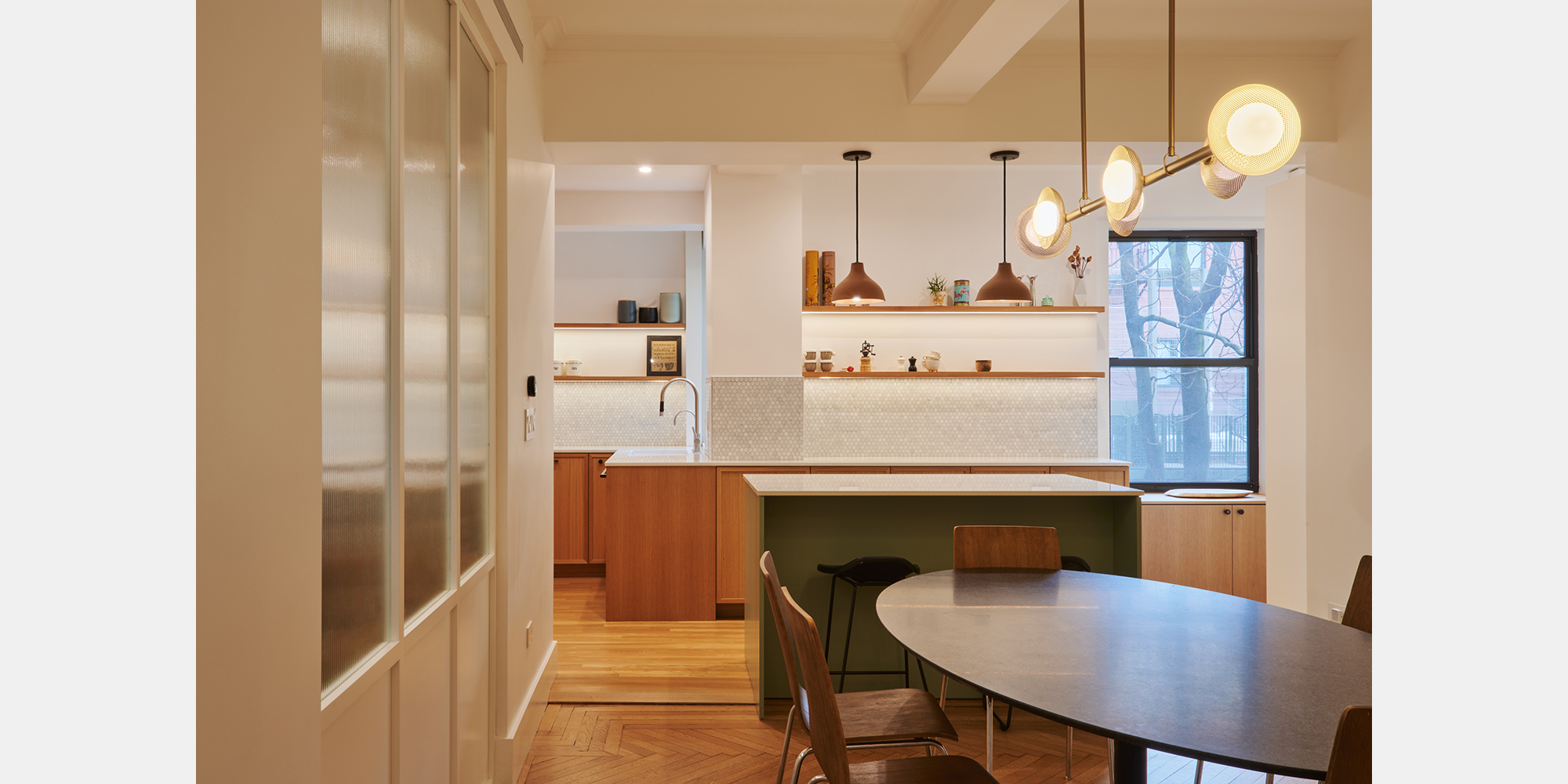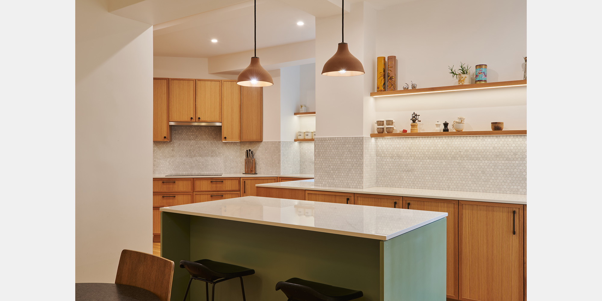 The kitchen presented a particular configuration challenge, working within the constraints of an existing structural layout to create an open, functional space, resolved through wood cabinetry, open shelving and a sage green island topped in white stone. A dedicated home office was carved from the existing footprint, providing a quiet, purposeful workspace without compromising the apartment’s flow.